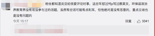 也有人留言評論稱,“粉絲都知道炎亞綸很愛評論時事,這些年懟過柯文哲罵過蔡英文 ,環保屆政治界教育界沒有他沒參與過的話題,但他絕對是沒有惡意,重點立場也是沒有問題的”↓