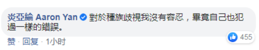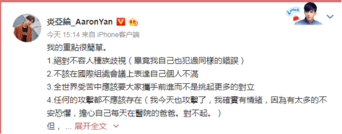 今天下午15時14分,炎亞綸在微博發文對其臉書內容“解釋”稱,他的重點是*“絕對不容人種族歧視;不該在國際組織會議上表達自己個人不滿;全世界受苦中應該要大家攜手前進而不是挑起更多的對立;任何的攻擊都不應該存在”。* 他説自己今天也攻擊了,確實有情緒,“因為有太多的不安恐懼,擔心自己每天在醫院的爸爸。對不起。”並在文中呼籲網民“勿上綱上線”。