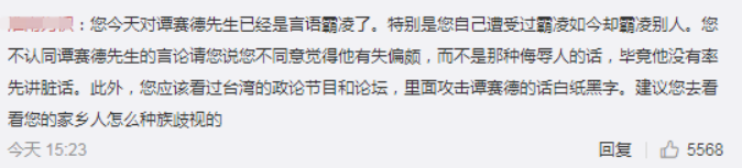 有大陸網民則認為,炎亞綸今天對譚德塞已經是言語霸凌了。 炎亞綸不認同譚德塞的言論可以説不同意覺得他有失偏頗,而不是那種侮辱人的話,畢竟譚德塞沒有率先講髒話。該網民還表示,炎亞綸應該看過台灣的政論節目和論壇,裏面攻擊譚德塞的話白紙黑字。建議炎亞綸去看看他的“家鄉人”怎麼種族歧視的。↓ · 蔡英文立馬“抗議”,竟還發了個邀請