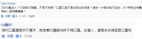 如今,民進黨當局又將捐贈600萬隻口罩,有網友表示,“又600萬送人?又排隊又預購,不是不夠嗎?口罩工廠不是加班加的很慘?連多一片都計較不給的,817們有沒有覺得被人耍得團團轉?”
