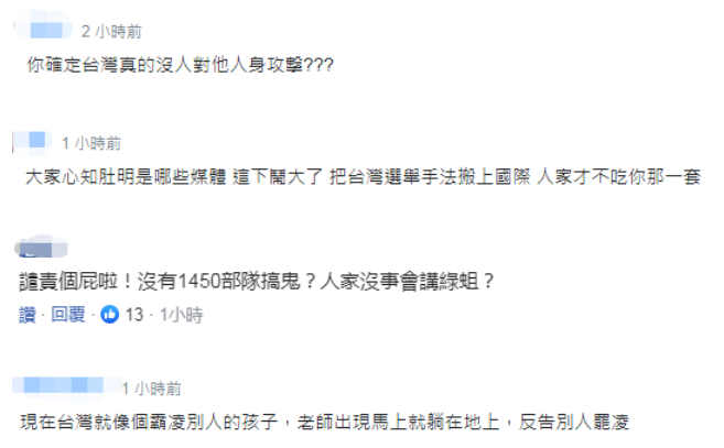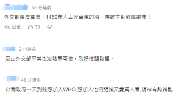 有網民則表示,攻擊謾罵是事實,這有什麼好否認的,本來就是台灣人在攻擊他,“外交部”官員沒看到聽到?他説的是事實,我真的看過1450網軍們(綠營網軍)的留言,還罵得挺難聽的。↓