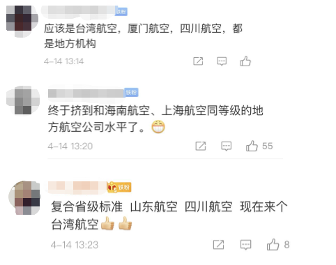 對於華航改名一事,有大陸網民則表示,應該是台灣航空。終於擠到和海南航空、上海航空同等級地方航空公司水平。符合省級標準。↓