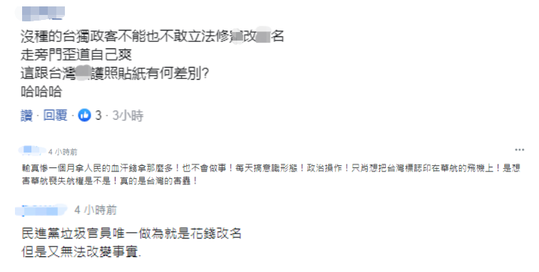 還有島內網民諷刺華航飛機貼“台灣標誌”稱,這跟貼紙護照有何區別,“台獨”政客走旁門歪道自己爽,有人則批評,蘇貞昌拿民眾血汗錢不做事,每天搞意識形態,把台灣標誌印在華航飛機上,是想害華航喪失航權是不是?真是台灣的害蟲。民進黨垃圾官員唯一作為就是花錢改名,但又是無法改變的事實↓