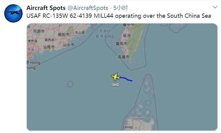 【環球網報道 記者 徐璐明】記錄軍事飛行器動態的社羣媒體“飛機守望”4月15日披露稱,美國空軍一架編號為62-4139的RC-135W電子偵察機當天在南海海域上空飛行。在4月14日,也有一架編號為161586的美國海軍的P-3C反潛巡邏機在南海上空飛行。