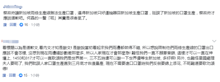 台灣“中時電子報”此前報道稱,在經過了台灣網軍一天的謾罵攻擊,何晶將臉書貼文修改後,台灣地區流行疫情指揮中心指揮官陳時中13日下午承認,台灣口罩禁運的時候,讓這兩條生產線不能生產,對新加坡造成困擾。他還説,台灣和新加坡有很多計劃合作中,網絡上大家發言有很多,“討論”也可以停了。