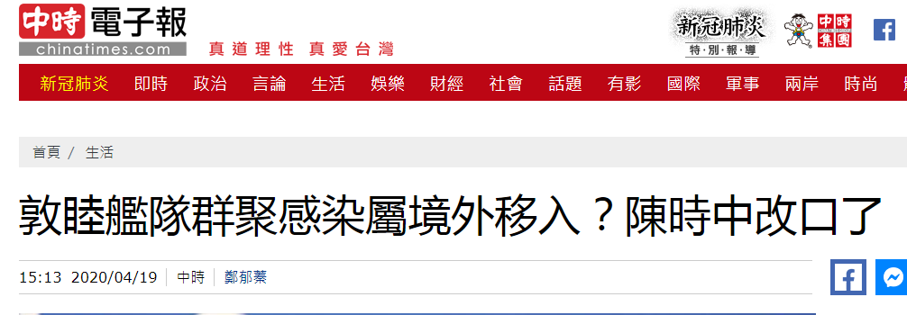 在今天的記者會上,陳時中也改口了。據台灣“中時電子報”報道,昨日還將艦隊中確診者稱為“境外移入”病例的陳時中今天稱,在案情還不清楚之前,不分境內境外,以“敦睦遠航訓練支隊”類別來進行調查。昨天提到可能在帕勞感染,是沒有把話講清楚,指揮中心認為還需要更多調查,才能知道來龍去脈。