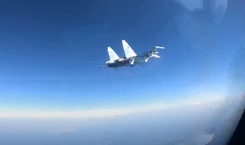美國第六艦隊發佈的俄軍蘇-35戰鬥機向美軍P-8A反潛巡邏機靠近的畫面