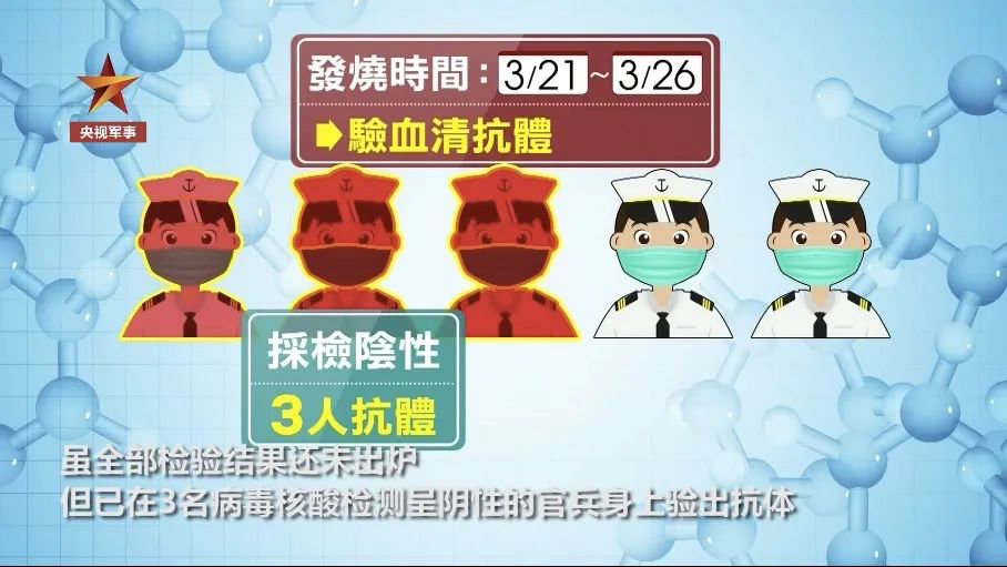 為追查感染源,指揮中心要求“敦睦”艦隊700多名官兵做血清抗體檢測,雖然全部檢驗結果還未出爐,但已在3名病毒核酸檢測呈陰性的官兵身上驗出抗體 。