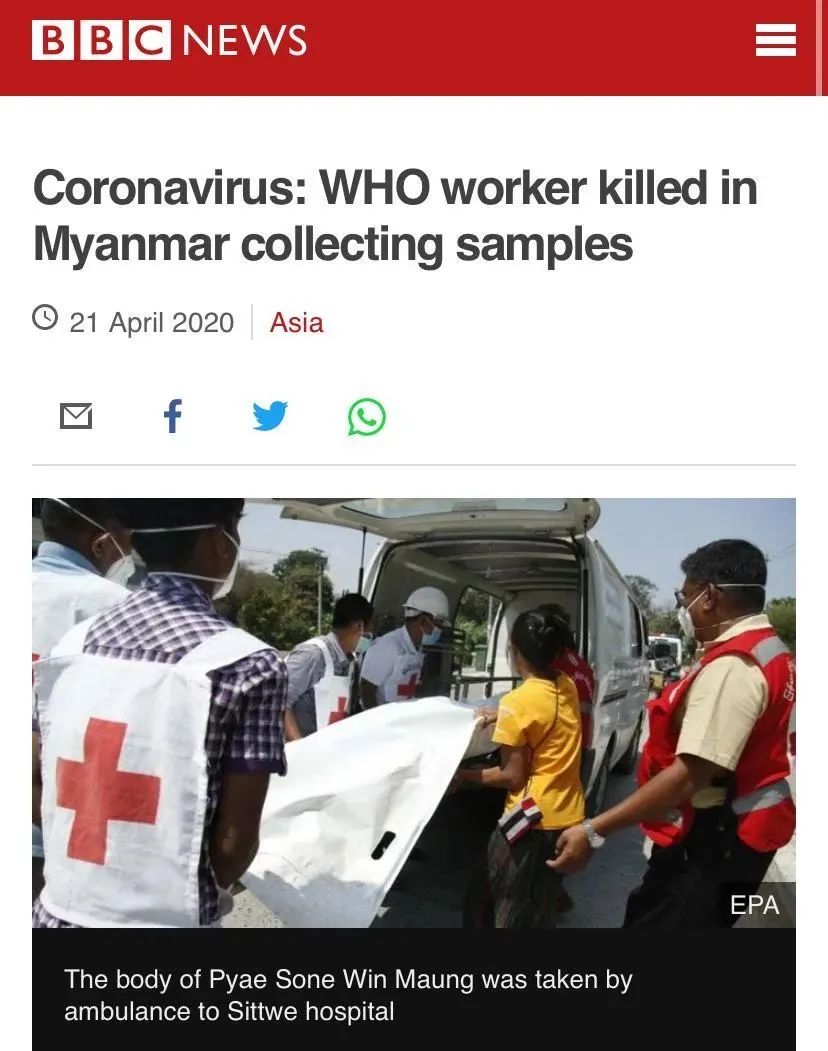 此前,據緬甸政府消息,1輛從若開邦運送新冠肺炎疑似病例化驗樣本的車輛於當地時間4月20日在敏比亞鎮遭遇民族武裝襲擊,2名工作人員受傷,其中1人於4月21日救治無效去世。遇襲車輛上有明顯的聯合國和世衞組織的標誌。