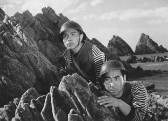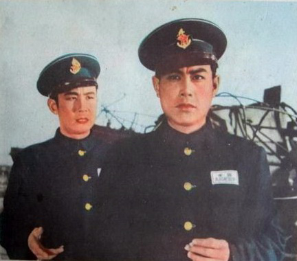 某魚雷快艇的水手長陳福海(孟慶良飾)和新戰士李正良(趙矛飾)。鋼盔、海魂衫、救生衣、54式衝鋒槍……