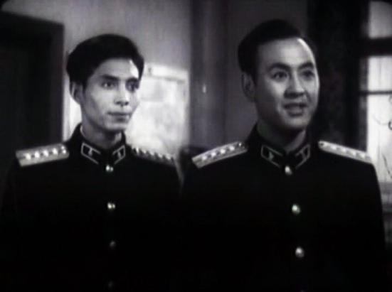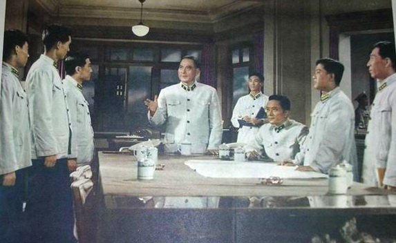 司令員(張翼飾)等在作戰會議上。他們穿的55式軍服,怎麼不戴肩章呀?原來,從1958年起我軍對55式軍服作了一些修改,主要是軍官平時佩帶軍銜領章,肩章只在重要場合佩帶;士兵取消船形帽,改戴解放帽;軍官大檐帽在重要場合與肩章配套戴用,平時也改為解放帽。這些改革統稱為58式服裝。影片拍攝於1963年,圖中海軍軍官穿的正是58式軍服,沒有戴肩章,因為是在室內,也沒有戴軍帽。不過,海軍與陸空軍不同,海軍軍官不戴肩章時也不戴解放帽,而是戴大檐帽。
