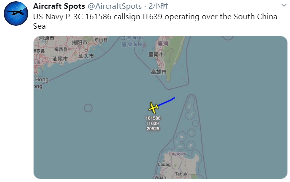 報道稱,推特賬號“飛機守望”(Aircraft Spots)稱,今天早上美國海軍一架P-3C獵户座反潛機出現在台灣南部海域,由東北往西南朝南海方向行進。台防務部門又宣稱,台海周邊海空域情況,台軍都全程掌握。
