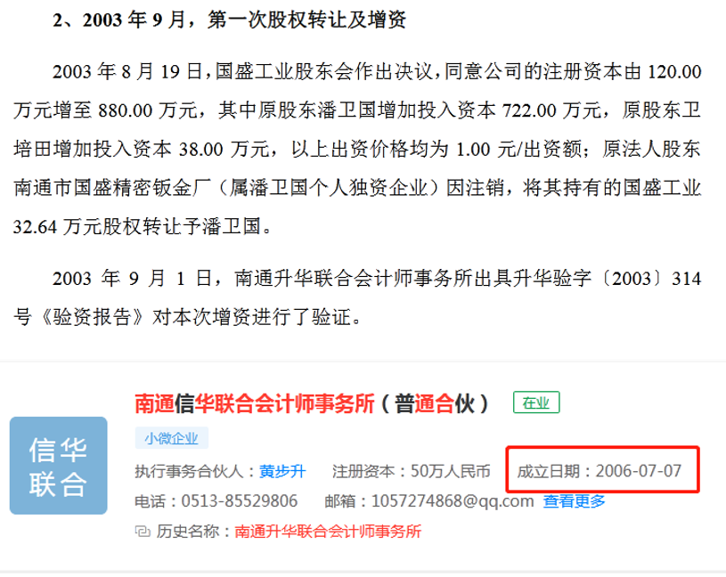 其實,潘氏家族一股獨大也並非一以貫之。資料顯示,國盛智科公司前身國盛有限成立於1999年8月31日,系潘衞國、衞培田、南通市國盛精密鈑金廠共同出資設立。目前,發起人股東衞培田已經退出,此次國盛智科招股書並未披露其退股時間及價格。但之前的招股書,公司詳細披露了國盛智科股權的變更。其中提到,2003年8月19日,公司進行第一次股權轉讓及增資,2004年5月,公司進行第二次增資;2005年3月,公司進行第三次增資,2006年4月,公司進行第一次減資。而上述股權變更及資本動作,南通昇華聯合會計師事務所分別出具了驗資報告。然而可以查詢的公開資料卻顯示,南通昇華聯合會計師事務所成立於2006年,遠晚於上述驗資報告出具時間。這一BUG,加之改來改去的財務數據也給國盛智科財務真實性打上大大問號。