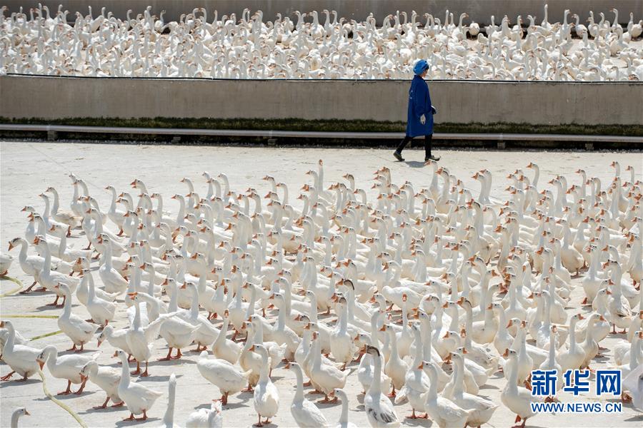 4月26日,工人在貴州省錦屏縣銅鼓鎮馬台生態種鵝養殖基地工作。 近年來,貴州省黔東南苗族侗族自治州錦屏縣把鵝產業作為“一縣一業”主導產業來發展,通過訂單農業、入股分紅、保底回收、貸款貼息等方式,着力打造鵝培育、鵝養殖、鵝銷售及鵝絨產品加工為一體的產業發展體系,帶動羣眾增收致富。 截至目前,錦屏縣建成鵝養殖示範基地21個,帶動14000餘人增收。 新華社發(彭澤良 攝)
