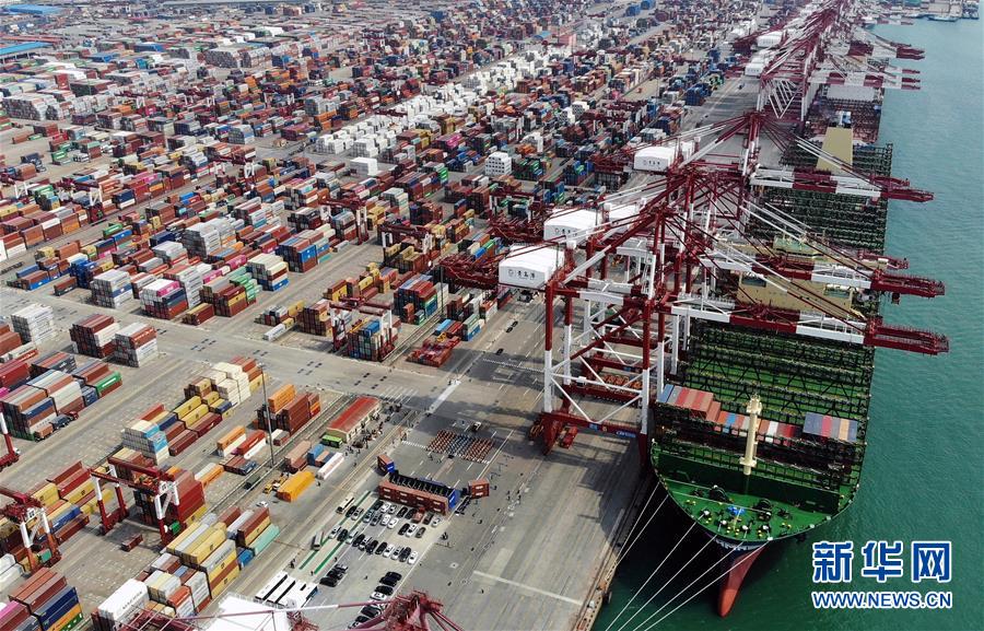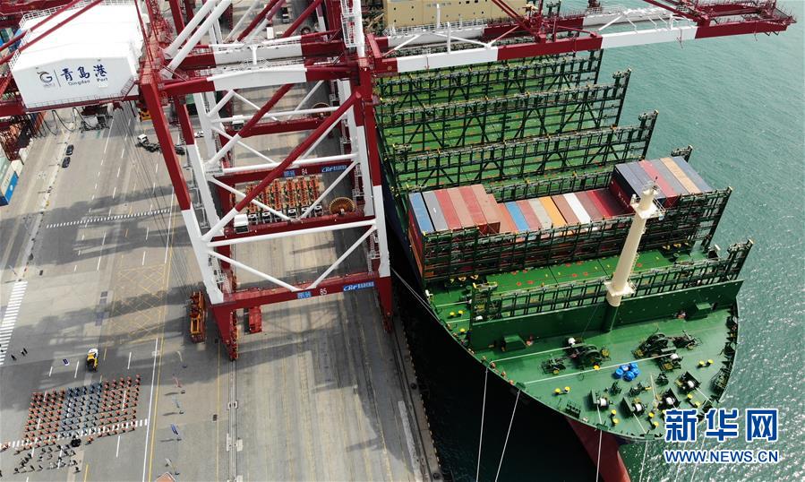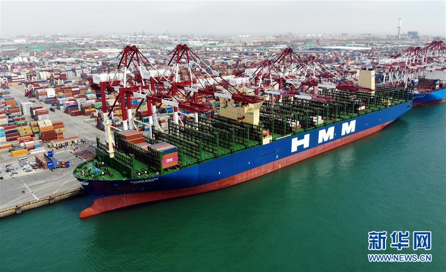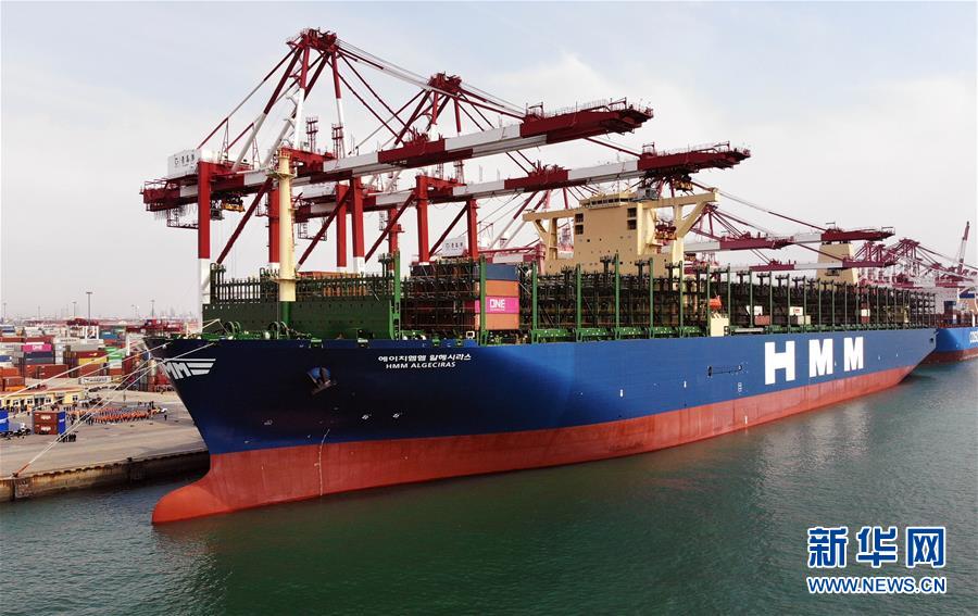 “現代商船阿爾赫西拉斯”輪靠泊在青島港前灣碼頭(無人機照片,4月26日攝)。 當日,載箱量可達2.4萬標準箱的世界最大集裝箱船“現代商船阿爾赫西拉斯”輪從山東青島港開啓首航,這條船的甲板面積超過2.4萬平方米,相當於3.5個標準足球場大小。 新華社記者 李紫恆 攝
