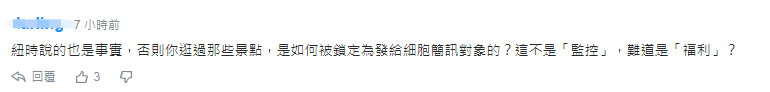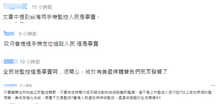 與民進黨當局反映不同,對於《紐約郵報》相關報道,有島內網民表示,民眾被監控這是事實啊。只要離開住所就能立即監控開罰,只要特定時間行經可疑地點就被細胞簡訊騷擾,這不是公然監控民眾行蹤?↓