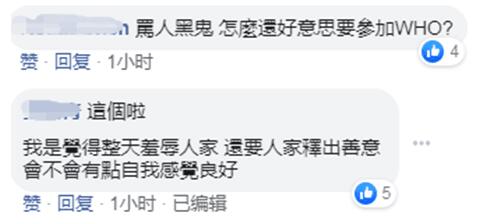 還有網民提及譚德塞被台灣網軍攻擊一事表示,整天羞辱人家,還要人家釋出善意,會不會有點自我感覺良好。罵人“黑鬼”,怎麼還好意思要參加WHO?↓