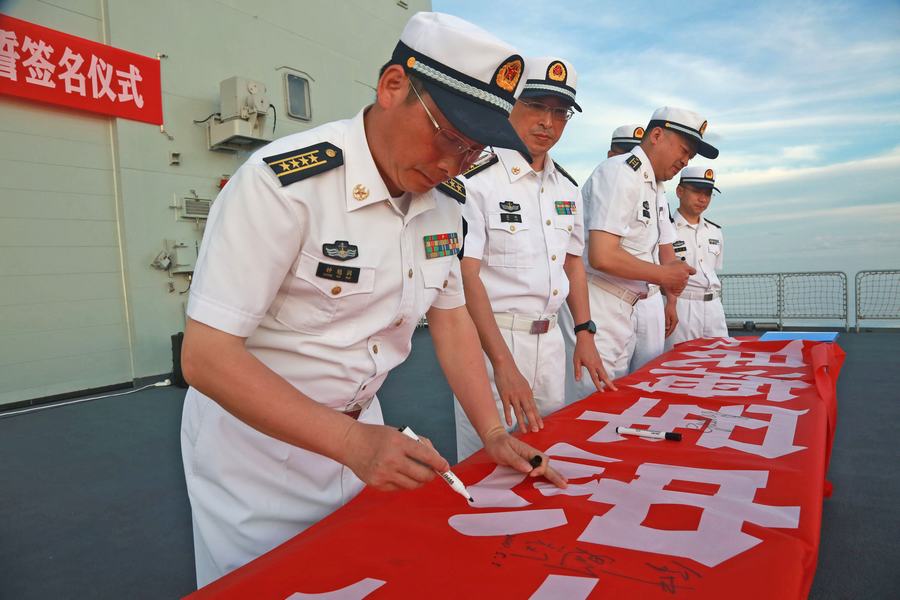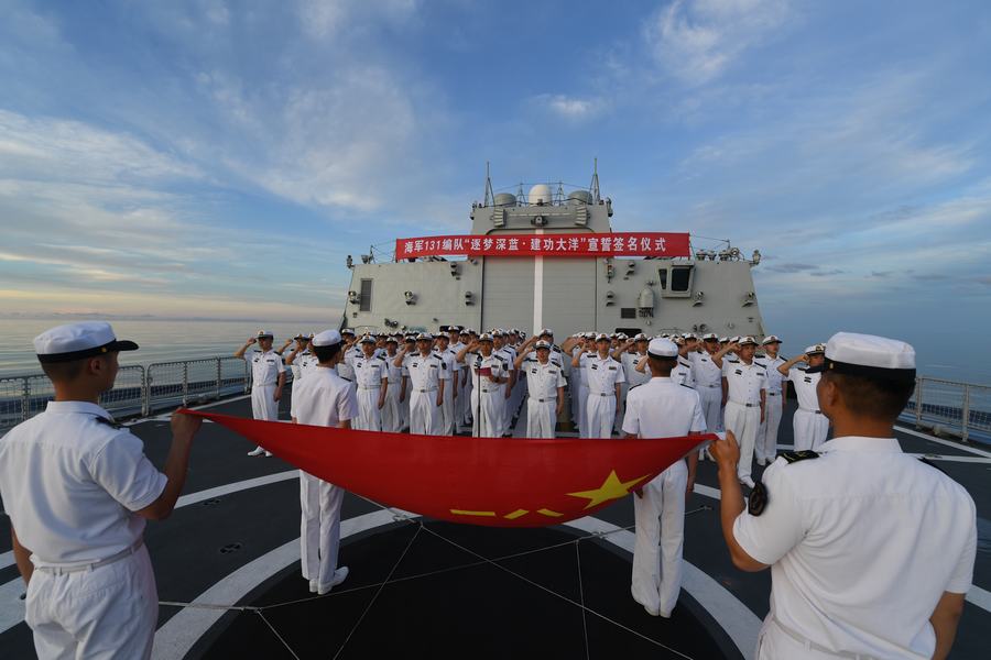 “嗚--”宣誓活動在汽笛聲中開始。身着全白夏常服的官兵,軍容嚴整,威武列隊,他們共同面朝祖國高唱國歌、面對軍旗豪邁宣誓、面向深藍莊重簽名,表達對祖國和人民的無限忠誠、對投身護航使命的無上榮光。