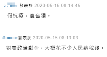 還有網友對民進黨當局不滿表示,“假抗疫,真台獨”;“對美政治獻金,大概花不少民眾納税錢。”