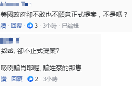 然而,對於台外事部門的反應,島內網友潑了一盆冷水,稱“美國政府卻不敢也不願意正式提案,不是嗎?”“致函,卻不是正式提案?”