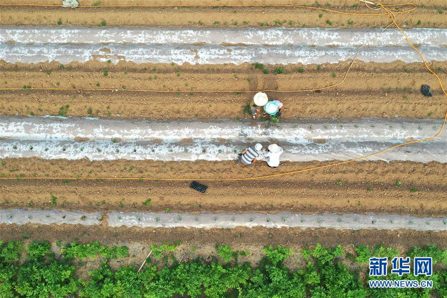 5月21日,安徽省亳州市譙城區趙橋鄉雙樓村農民在田間勞作(無人機照片)。 初夏時節,農民在田間勞作的身影構成一幅幅優美畫卷。 新華社發(劉勤利 攝)