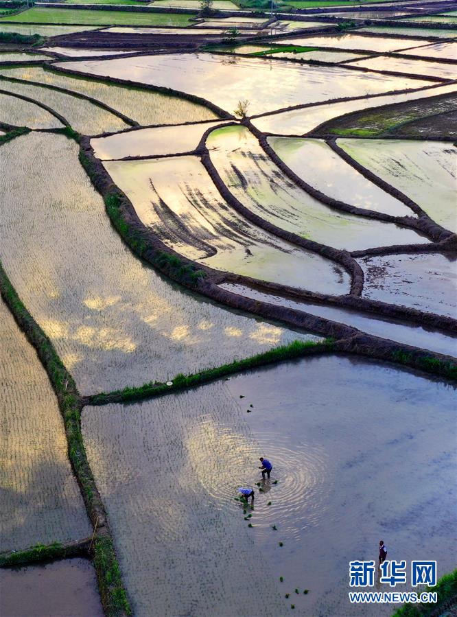 5月22日,農民在湖南省湘西土家族苗族自治州龍山縣石羔街道幹比社區耕田(無人機照片) 。 初夏時節,農民在田間勞作的身影構成一幅幅優美畫卷。 新華社發(曾祥輝 攝)