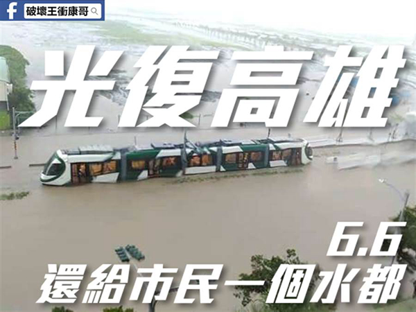 臉譜網(facebook)粉絲專頁“破壞王衝康哥”昨日在粉絲團發文諷刺,“水上樂園不好嗎?水上輕軌不好嗎?過去,高雄淹的不只是水,淹的是滿溢的台灣價值!自從國民黨奪走高雄之後,連台灣價值都消退了!這不是我們愛的高雄,更不是幸福之都!”附圖可見當時8/23高雄夢時代購物中心周邊因嚴重積水,出現輕軌在水上行駛的照片。其他網友也紛紛開酸,“6.6之後就不會淹水了更不會積水,地永遠是乾的”“營造一個水都樂園, 要付出多少年心思”。(中國台灣網 李寧)