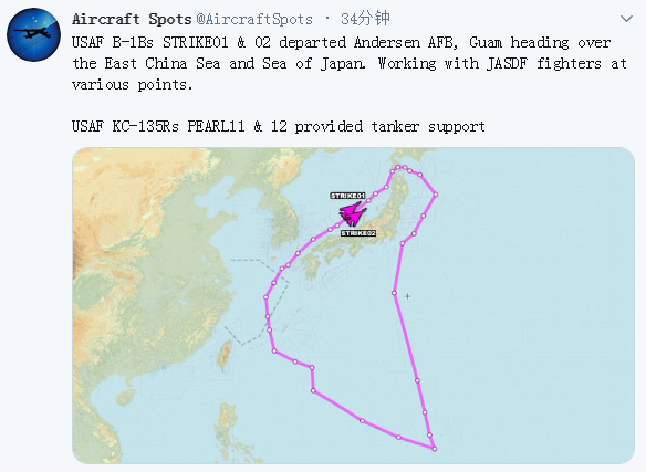 據記錄軍事飛行器動態的社羣媒體“飛機守望”5月27日發佈的消息顯示,兩架美國空軍的B-1B戰略轟炸機從關島安德森基地起飛,以逆時針方向對日本開展繞飛訓練,期間還一度進入了東海上空。美國空軍的兩架KC-135R加油機為B-1B戰略轟炸機提供了空中加油支持。