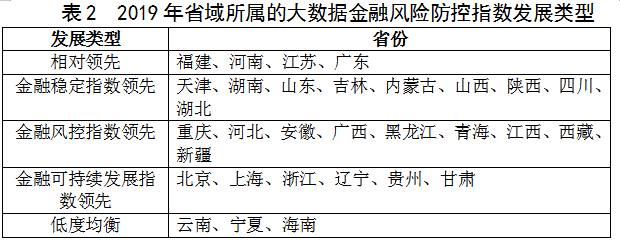 課題組結合總指數與3個分指數的得分情況(如表1所示),把2019年中國大數據金融風險防控指數發展類型分為相對領先型、金融穩定指數領先型、金融風控指數領先型、金融可持續發展指數領先型和低度均衡型5種類型(如表2所示)。劃分結果顯示,福建、廣東等總指數得分較高,屬於相對領先型;天津、湖南等金融穩定指數得分高,屬於金融穩定指數領先型;重慶、河北等金融風控指數得分較高,屬於金融風控指數領先型;北京、上海等金融可持續發展指數得分較高,屬於金融可持續發展指數領先型;雲南、寧夏和海南得分並不理想,但相對均衡,屬於低度均衡型。
