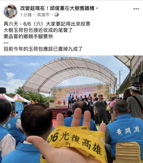 2020高雄鳳荔季開幕典禮30日上午舉行,韓國瑜與多位局處首長、議員均出席這場盛事,民進黨議員邱俊憲也參加了這場活動。儀式進行到請在場來賓上台時,包括司儀、高雄市新聞局長鄭照新皆上前邀請邱俊憲一同上台,但他當場婉拒,仍然坐在台下貴賓區。不料,沒多久邱俊憲就在臉譜網發文,寫着“再六天,6/6(六)大家要記得出來投票”,並附上一張在台下手拿“光復高雄”黃絲帶、台上韓國瑜正在頒獎的照片。