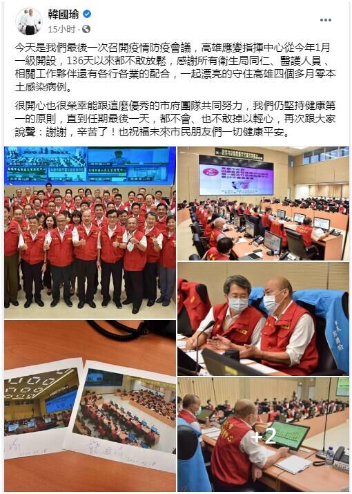 報道提到,昨晚(8日晚),韓國瑜還於臉書提早發出“畢業照”。韓國瑜附文寫道:今天是我們最後一次召開疫情防疫會議,高雄應變指揮中心從今年1月一級開設,136天以來都不敢放鬆,感謝所有衞生局同仁、醫護人員 、相關工作夥伴還有各行各業的配合,一起漂亮的守住高雄四個多月零本土感染病例。