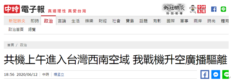 據“中時電子報”6月9日報道,台灣防務部門表示,當天上午偵測到解放軍的多架蘇-30戰鬥機短暫飛入台灣西南空域。台灣防務部門單方面宣稱,台軍負責偵察和巡邏的戰機全程掌握解放軍戰機飛行,並用廣播進行警告,採取了“驅離”措施。