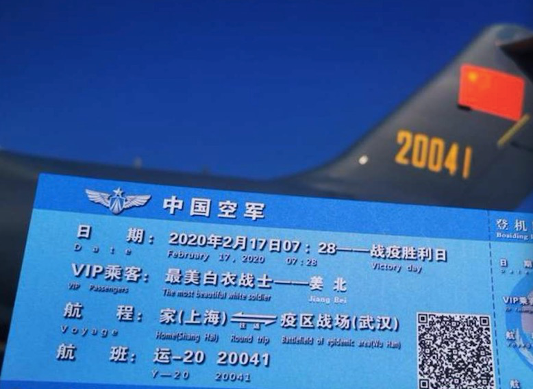 從電視畫面看,飛往俄羅斯的運-20飛機編號為20041,這是抗疫“明星機”。2月13日運-20首飛武漢時,“20041”就是其中一架。2月17日,20041再度出征,史上最“硬核”“運-20機票”由此誕生,機票正面日期欄寫着當天出發的時間至戰疫勝利日,乘客信息欄寫着“最美白衣戰士”,航程信息則寫有:家至戰場(武漢)。值得注意的是,機票上標記的是雙向箭頭,預示着醫護人員一定能平安凱旋。