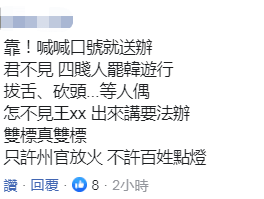島內網民對此事的看法則各持己見。有人支持應該依法嚴辦,有人質疑,“以前這樣講是司空見慣,現在這樣講就要被法辦!”喊口號就送辦,罷韓遊行時出現拔舌、砍頭…等人偶,怎不見王定宇出來講要法辦,真是雙標,只許州官放火,不許百姓點燈。還有人表示,(依此標準)之前向馬英九扔鞋的,那維安人員早就該開槍射擊啦!↓