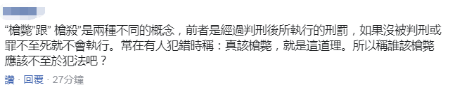 有人認為,“槍斃”跟“槍殺”是兩種不同的概念,前者是經過判刑後所執行的刑罰,如果沒被判刑或罪不至死就不會執行。常在有人犯錯時稱:真該槍斃,就是這道理。所以稱誰該槍斃應該不至於犯法吧?↓