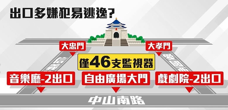 台媒指出,行兇女子從“中正紀念堂”內,沿路邊走邊揮刀,至少步行了500米。而“中正紀念堂”作為台灣重要觀光景點,附近有多個出口,但只有46支監視器,還發生隨機揮刀傷人。對此,轄區警方也正在加強周邊巡邏,並且啓動社區安全網,避免讓觀光熱點成為治安死角。(海外網 吳倩)