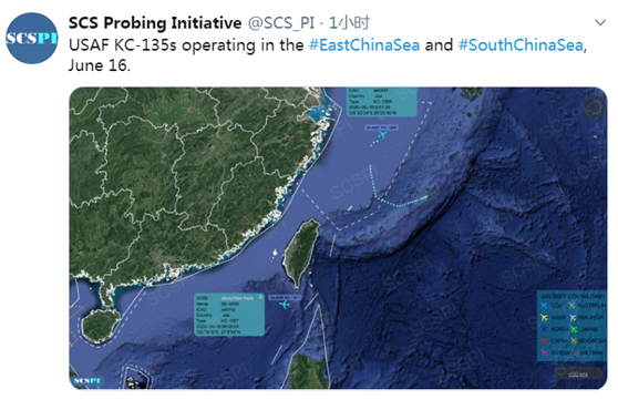 報道稱,“SCS Probing Initiative”公佈的圖片資料顯示,美軍二架KC-135空中加油機今日接近東海與巴士海峽,接近東海的那架美國軍機自沖繩起飛,距離台灣較遠,而飛越巴士海峽的軍機,則未清楚標定起飛地與航跡。對此,台防務部門還是那句老話:台軍“對於台灣周邊海空情動態都有掌握,籲請民眾放心”。