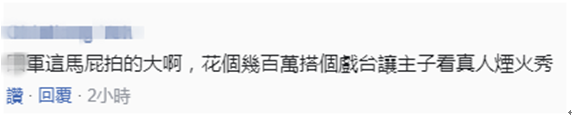 就台媒爆料的台軍“漢光演習”的內容,有網友在網上留言表示,“台軍這馬屁拍的大啊,花個幾百萬搭個戲台讓主子看真人煙火秀。”