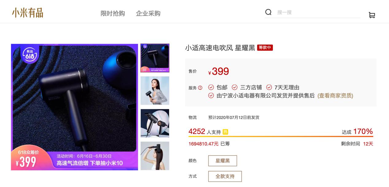 小米有品眾籌上架高速吹風機:每秒30次監測+智能控温