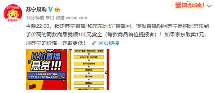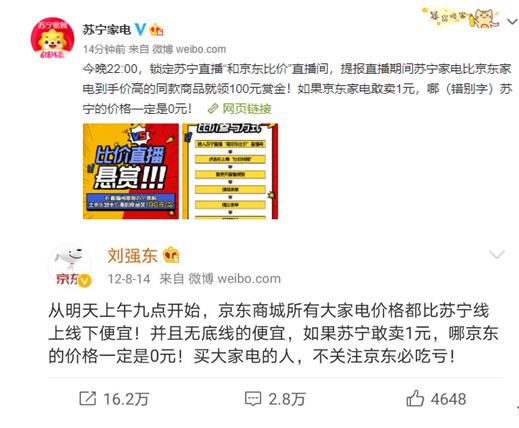 蘇寧易購這條官宣微博,直接喊話京東,瞬間引發全網熱議;此外,蘇寧手機、蘇寧超市等大家電、消費電子、快消百貨、廚衞家裝等蘇寧易購各品類官方微博,也都在同一時間向京東下達了戰書。還有網友指出,蘇寧家電的微博疑似在隱晦回應2012年劉強東對蘇寧易購大家電價格宣戰的微博。