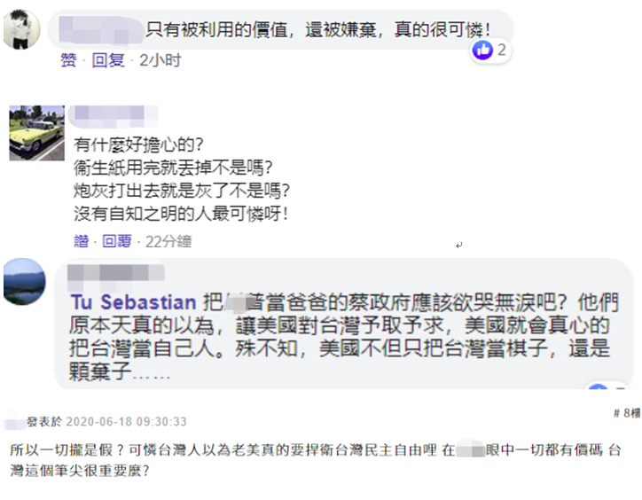 “所以一切都是假的?”有網友説,台當局只有被利用的價值,還被嫌棄,真的很可憐。↓