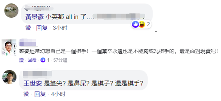 對此,有台灣網友説“小英都all in (押上所有籌碼)了”,有人勸幻想自己是“棋手”的蔡英文還是面對現實吧,因為“棄卒永遠不能成為棋手”。↓