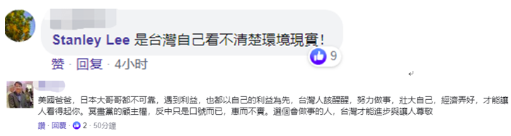 還有網友説,是台灣自己看不清楚現實,“美國爸爸”“日本大哥”都不可靠,台灣人該醒醒,壯大自己,才能讓人看得起。↓