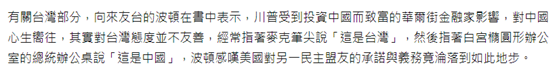 向來友台的波頓(即博爾頓)在書中表示,特朗普受到投資中國而致富的華爾街金融家影響,對中國心生嚮往,其實對台灣態度並不友善,經常指着麥克筆尖説“這是台灣”,然後指着白宮橢圓形辦公室的總統辦公桌説“這是中國”,波頓感嘆“美國對另一民主盟友的承諾與義務竟淪落到如此地步”。↓