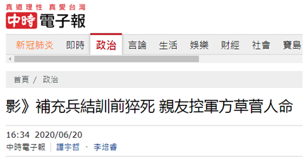 【環球網報道 記者 尹豔輝】據台灣“中時電子報”20日報道,台北市一名21歲詹姓男子6月在台陸軍第六軍團206旅關西營區服12天補充兵役,原本今日(20日)就要退伍,卻傳出在寢室猝死,其親友舉行記者會痛批台軍“草菅人命”。