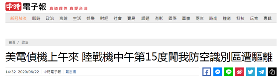 “中時電子報”還稱,今天上午美國海軍一架編號AE1D8A的EP-3E電偵機今天上午從巴士海峽一路往北飛後,進入台灣西南空域,隨後又左轉往南海方向飛去,離開台灣海峽。文章説,原本不知“今天是否又會與大陸軍機上演你來我去的躲貓貓戲碼”,果然,大陸軍機中午時分就進入了台灣西南空域。