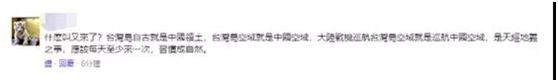 昨日(21日),台軍也曾證實,解放軍殲-10戰機一度進入台灣西南空域。有支持大陸的台灣網民表示,台灣島自古就是中國領土,台灣島空域就是中國空域,大陸戰機巡航台灣島空域就是巡航中國空域,是天經地義之事,應該每天至少來一次,習慣成自然。↓