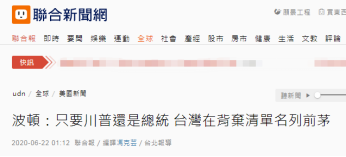 《聯合報》説,不論是杜魯門、尼克松或卡特政府,當年的政策調整都對台灣造成一定的傷害,但這樣的調整都是在考慮美國整體利益下做出的決定。反觀特朗普政府的決策,一如博爾頓在書中的描述,將個人的政治利益置於國家整體利益之上,這也是台灣成為“筆尖”、“棋子”等隨時可被拋棄或交易工具的最大風險。而民進黨當局選擇一面倒向美國的政策,把命運完全託付在美國善意上,讓台灣在美國與大陸之間失去幫自己爭取生存空間的自主性,也讓自己處於隨時可能被背叛的風險。