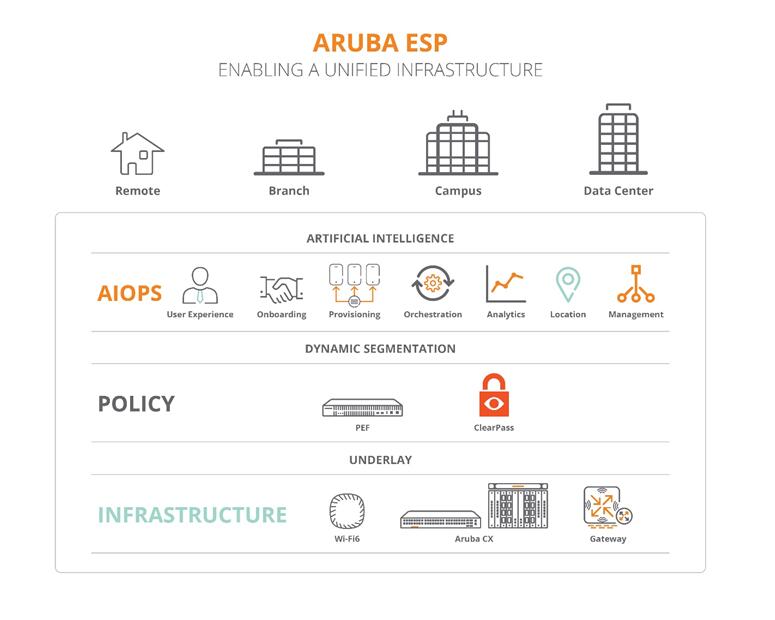 Aruba ESP 是目前業界可擴展性最高的全棧雲原生平台,適用於有線網絡、無線網絡和 SD-WAN 環境,整合多種網絡元素以實現集中管理和控制。Aruba ESP 基於Aruba 的基礎架構進行了優化,採用開放標準,可與第三方的解決方案與服務進行集成。這些重大創新還包括: