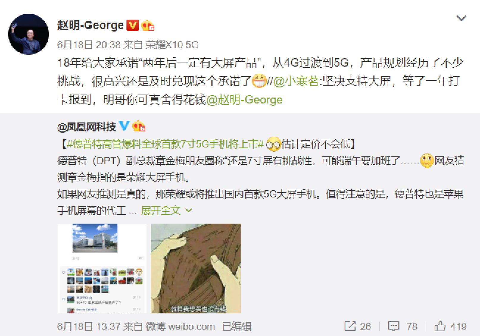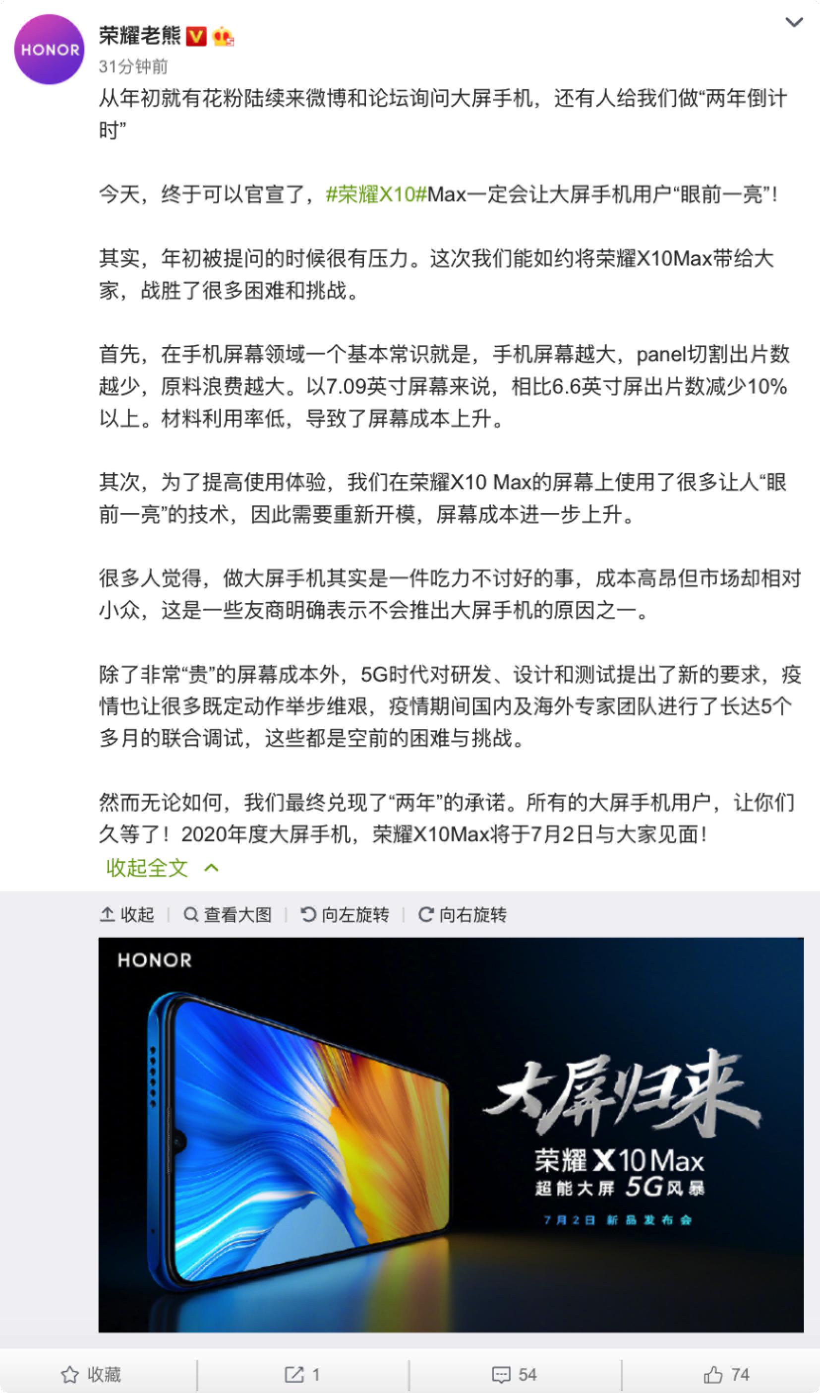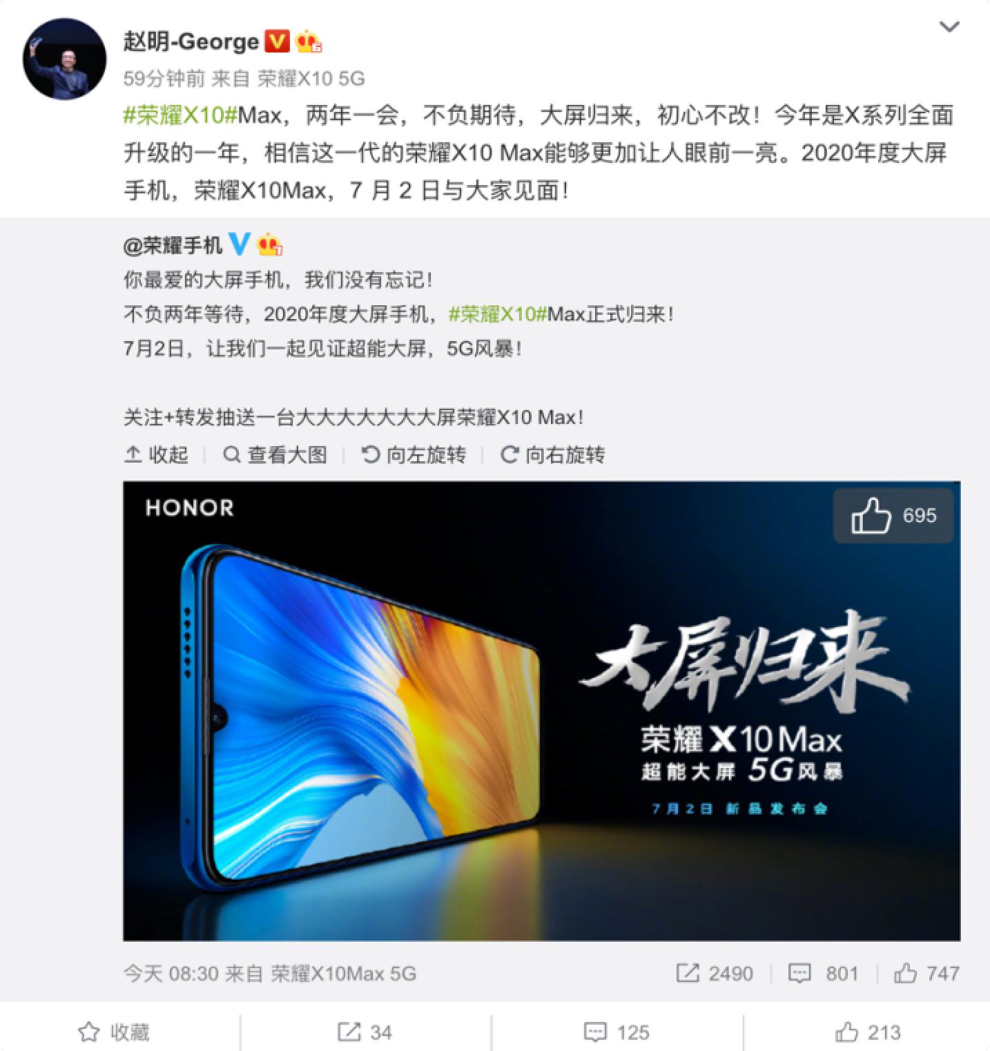 6月22號,榮耀手機通過官方微博宣佈X系列5G大屏手機榮耀X10 Max,將於7月2號正式發佈。隨後,榮耀總裁趙明轉發該微博,表示榮耀初心不改,兑現了兩年一更的大屏承諾。今年是X系列全面升級的一年,這一代的榮耀X10 Max必定會讓人眼前一亮。